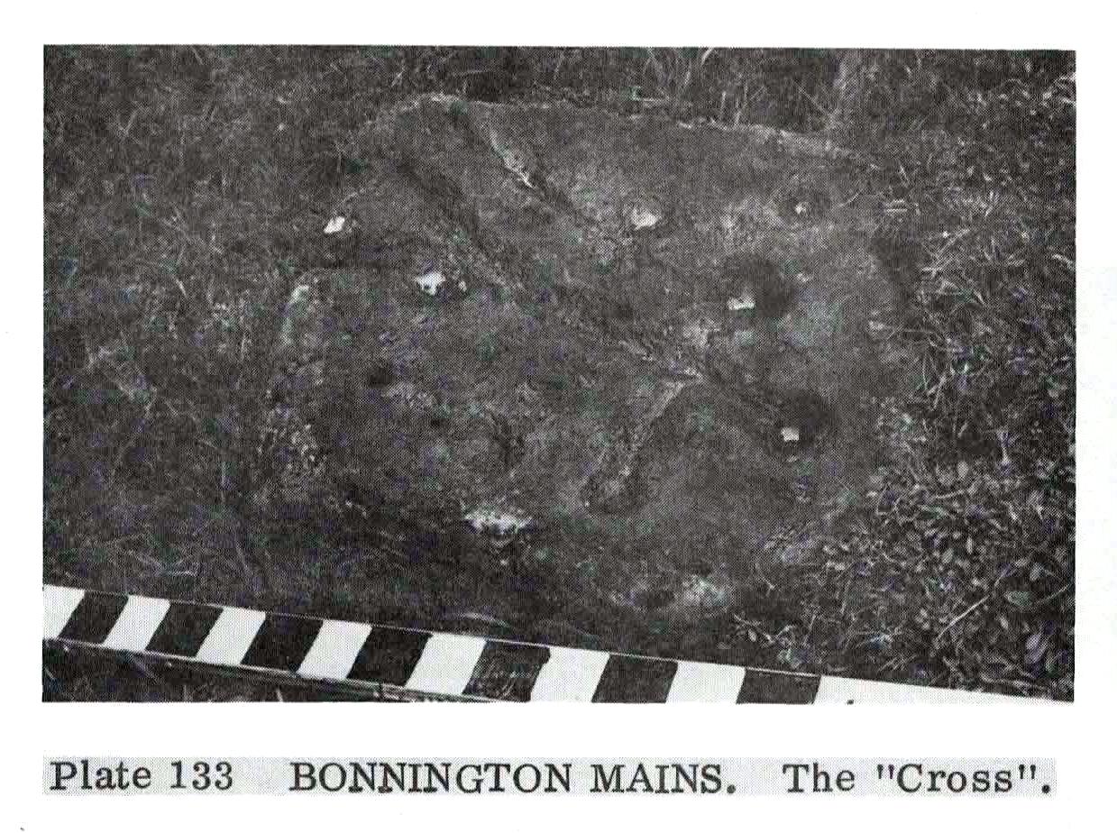 “The boulder is fractured in two places by natural agencies, but it shows traces of twenty cup-marks, varying from little more than half-an-inch to fully two inches in diameter, and there are two separate gutters. Seven at least of the cups are surrounded by single rings, and in two instances the rings are connected by shallow gutters to simple cup-marks. The largest cup-mark on the stone is encircled by one complete ring with three additional concentric arcs linking up four of the other rings. Another group consists of three cups, each surrounded by a ring, which are closely set in the form of a triangle, with three other smaller cup-marks in close proximity.”