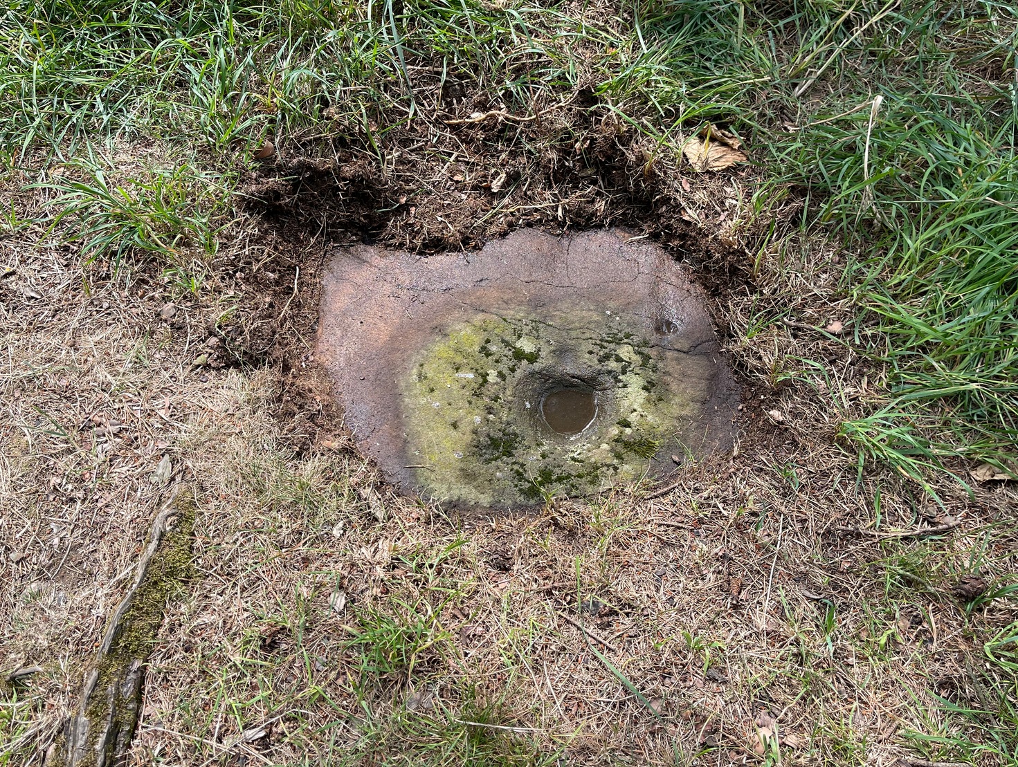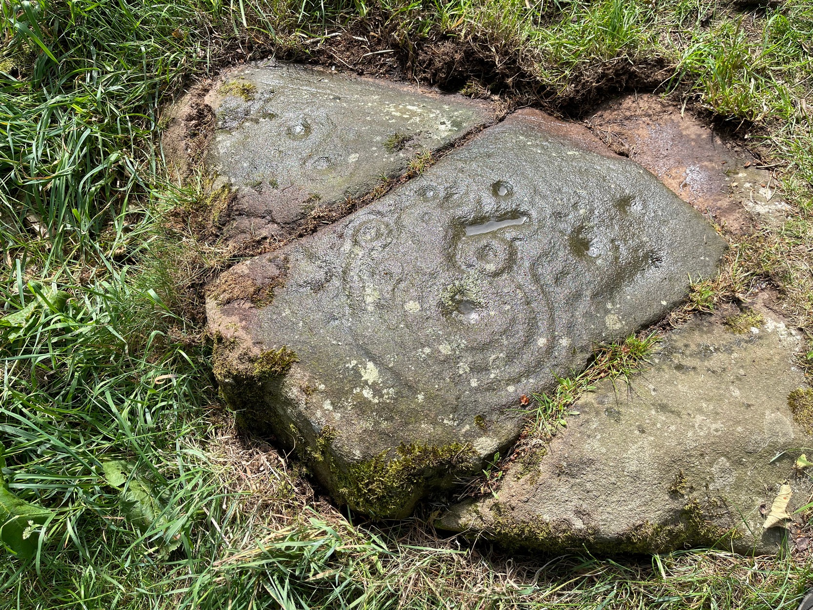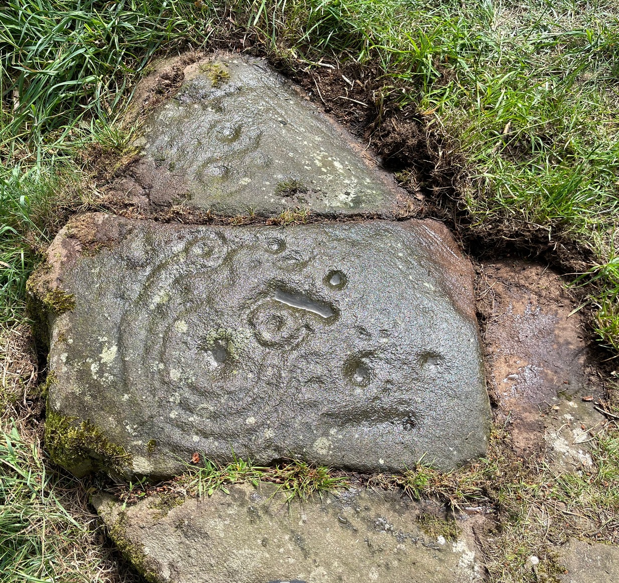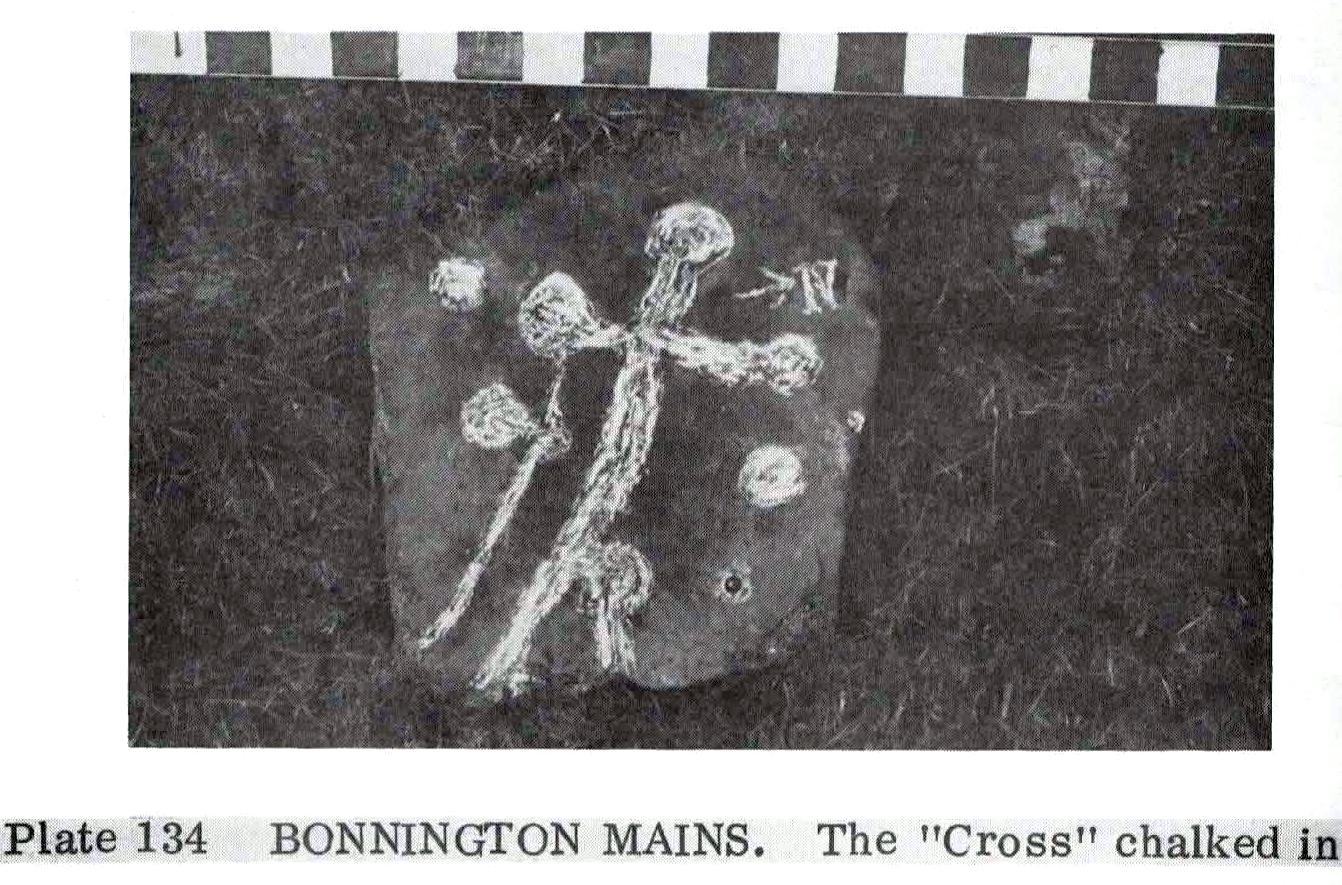 In November 1927, the Royal Commission dudes visited the carving (and its companions), but they had to roll back the turf to see it clearly. On the stone they saw that “at least nine or ten cup-markings, in some cases with connecting gutters, are still more or less clearly outlined.”