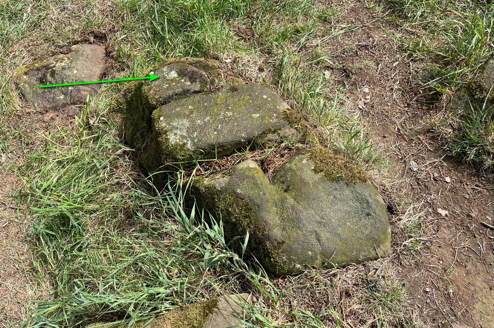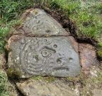 Take the same directions as if you’re visiting the Tormain (1) carving (the best one of the bunch here), but about five yards before reaching it, to your immediate left, just at the edge of where the hill drops down slightly, you’ll see a small flat rock poking out of the ground that may have been cut and quarried at some time in the past. That’s the one!