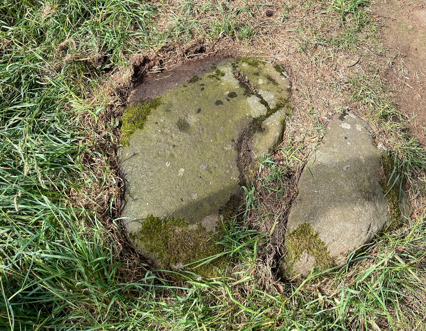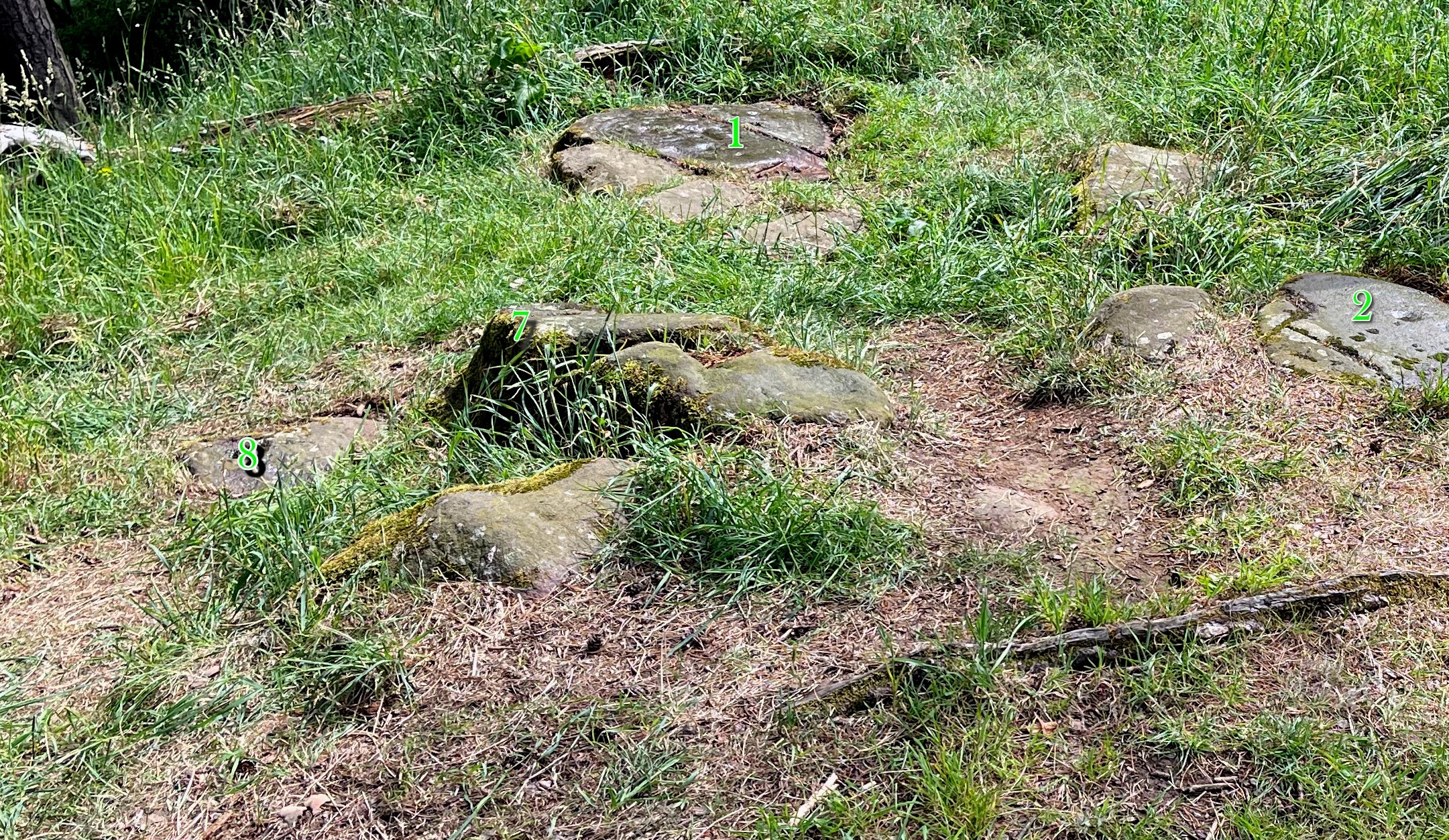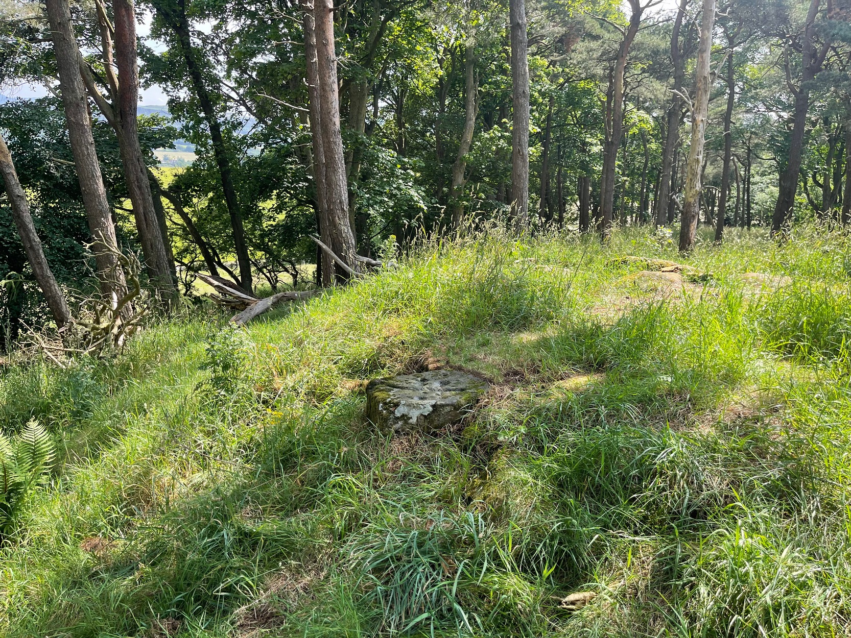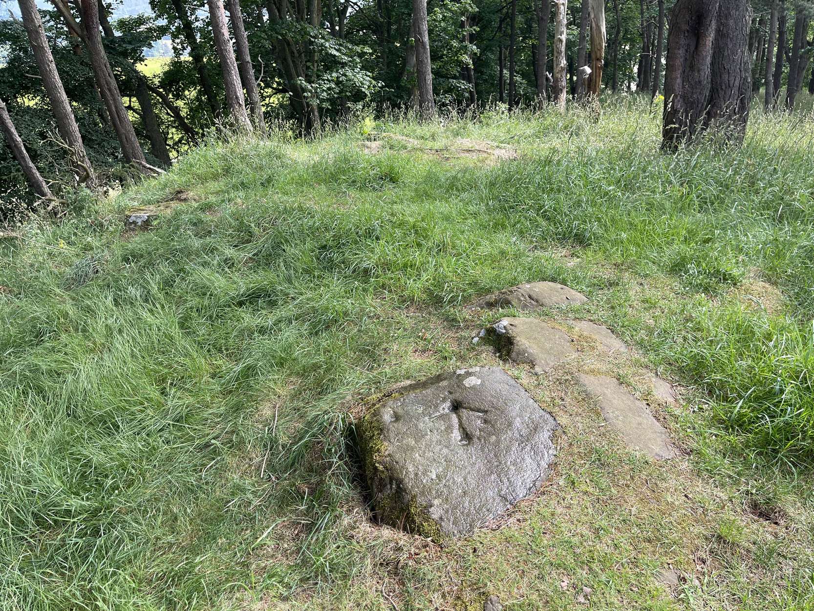 Best approached from Ratho village, head up Main Street towards Bonnington Mains. Shortly after the last road in the village (Halicroft Park, on the right) a small line of trees appears on the left and about 250 yards on a footpath takes you therein. Follow this for 250 yards (it runs parallel to the road) and the path then slopes uphill alongside the field. Go all the way to the top (roughly 500 yards) where the small copse of trees crowns the summit. On the ground there are a number of both small and medium-sized flat earthfast stones. You need to walk to the one at the end, just where the hill begins to slope back down. You’ll find it!