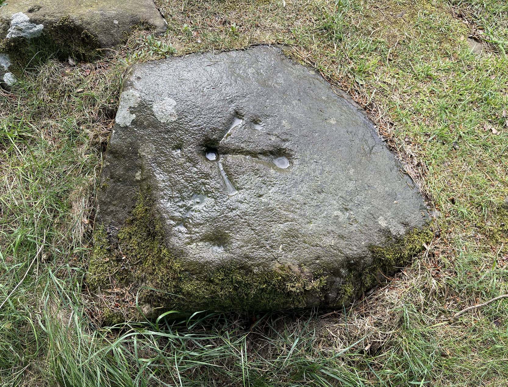 This is a notable design by virtue of the Ordnance survey lads marking it with an unusually large benchmark, utilizing at least one of the prehistoric cup-marks on their much more modern symbol. You can clearly see it in all the photos. The stone itself may have had a section of it cut or split from a once larger piece, probably in the 19th century when a lot of quarrying was being undertaken round here.
