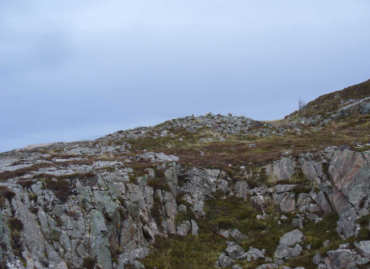 “…The cairn is about 4ft high, consisting of a mass of angular stones. On the S side the edge can be traced, and the indications are that the diameter was about 57ft. The edge on the N side is rather vague and may have been flattened in plan. On the E and W sides, where there are steep drops, the stones have evidently spread downhill, though on the E side parts of a roughly built edging can be seen.
