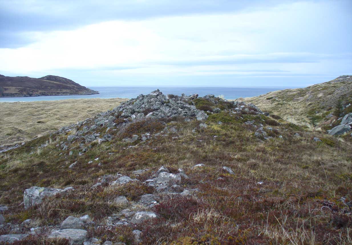 “The cairn-like structure…has an overall spread of about 17m including stone displaced downhill, and a height of 1.6m on the S side. On the summit a group of upright slabs protrudes up to 0.35m, and forms a rough oval 5.5m E to W, by 4.5m N to S. They seem to be on the inner side of a ring of stony material about 2.5m thick. In the interior is a disorganised mass of lintel slabs and three earthfast upright slabs. The structure appears to be a house with spaced uprights in the inner face of the wall, and with a series of uprights which helped to support a partly lintelled roof. A hollow on the N or seaward side probably indicates the position of the entrance.”