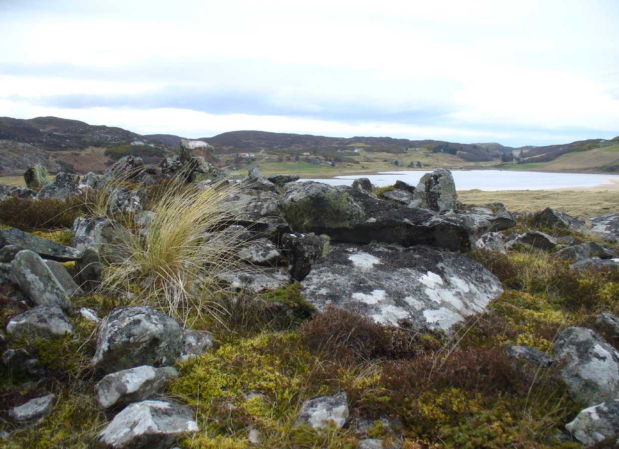 Along the A836 road between Bettyhill and Tongue, keep your eyes peeled for the turning down to Borgie and Skerray. Go along here for 1.8 miles (2.9km) until, just past a tiny road on your left, a small parking spot with a tourist board is by the roadside. Walk down hill and over the River Borgie below and follow the footpath round until your reach the edge of Torrisdale Beach. From here, walk right, uphill, across overgrown sand-dunes to the stone escarpment 400 yards or so to the east. A large scattered mass of rocks on top of one of the first rocky knolls is what you’re looking for. You can’t really miss it.