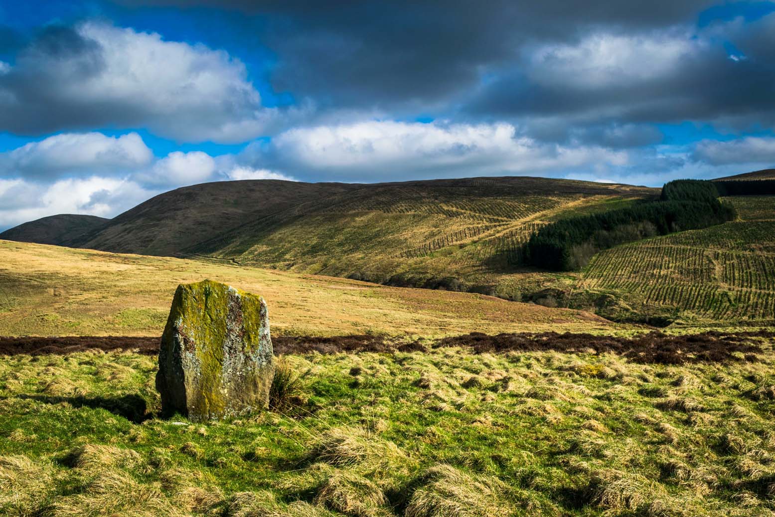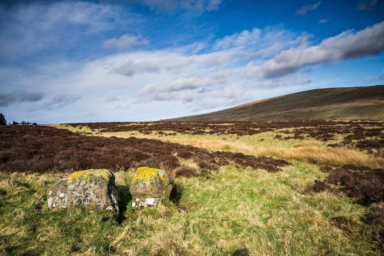 This is alleged to be just one standing stone in a straight line of five once-upright monoliths. Starting at the southwestern end of this row we have the 7ft-long cup-marked Sheriffmuir Carved stone — which certainly looks as if it stood upright in the not-too-distant past — and as we move up the line we pass another that’s been split in half. Another earthfast-looking rock is the next contender, before we reach our famous Wallace Stone, standing upright and proud on this moorland ridge. It’s about 6ft tall and 3ft across at its widest and certainly acts as a marker for the line of stones that allegedly stood upright here. And if we walk just a bit further up we have another big stone laid on the ground which is alleged to be a part of the same alignment.