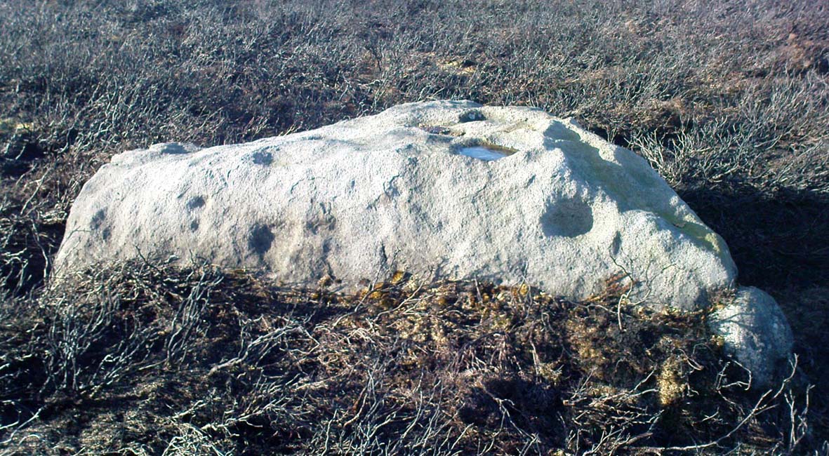 This is quite a large boulder, as the photos here show. At least two average-sized cup-markings have been etched onto the south face, and two larger ones accompany them on the same edge. There’s another larger cup-mark on the northeast side of the stone, and a possible companion, which may or may not be artificial. Then on top of the stone we have several large cups and a ‘bowl’ — though some of these upper markings may be natural, or just well-eroded cup-marks. It’s hard to tell for sure!