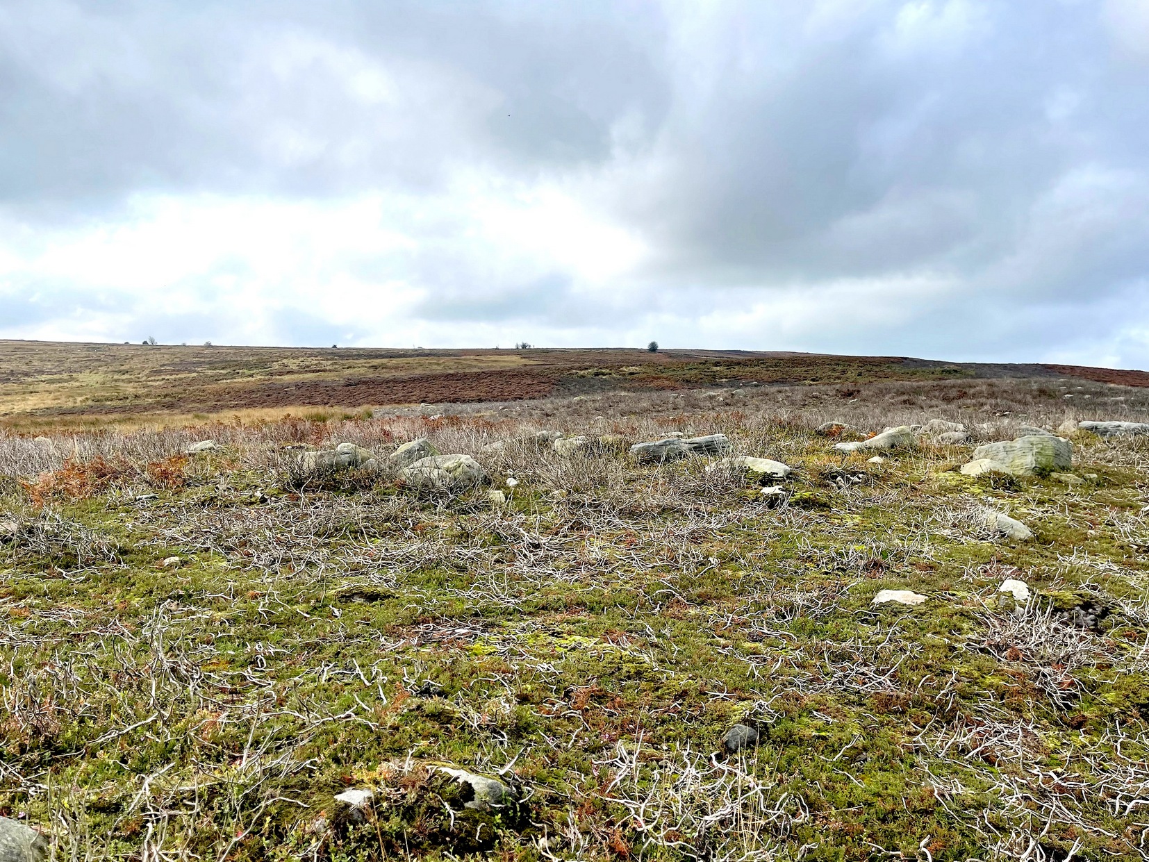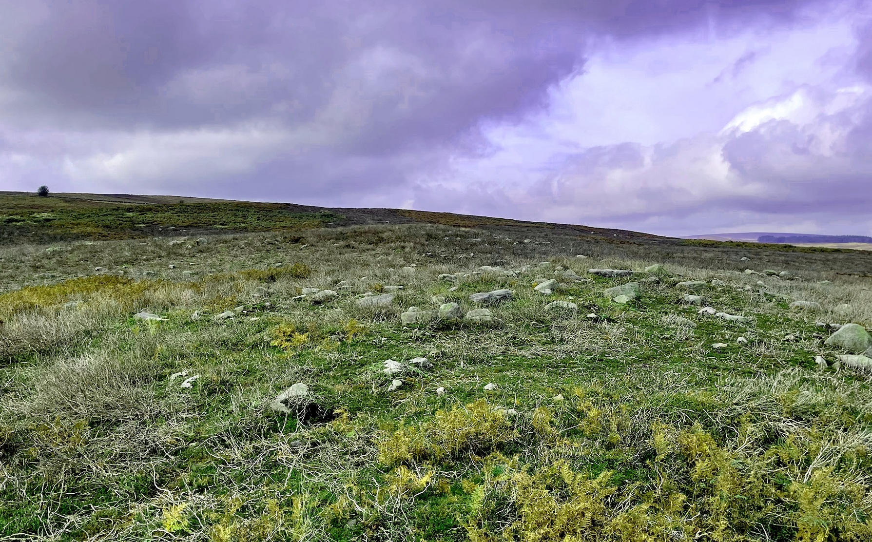 Park up at the singular dusty car-park on the east-side of Askwith Moor Road. If you walk to the sloping eastern edge of the car-park and then go down and over the collapsed fence onto the moorland immediately east, walk in the direction of the Tree of Life Stone to the north-east (be aware that there’s no footpath here and it’s boggy as fuck in places) . Just over halfway towards the carving, nearly 400 yards from where you’ve parked, you’ll begin to see various ruinous piles and scatters of stone. You can’t really miss them!