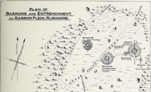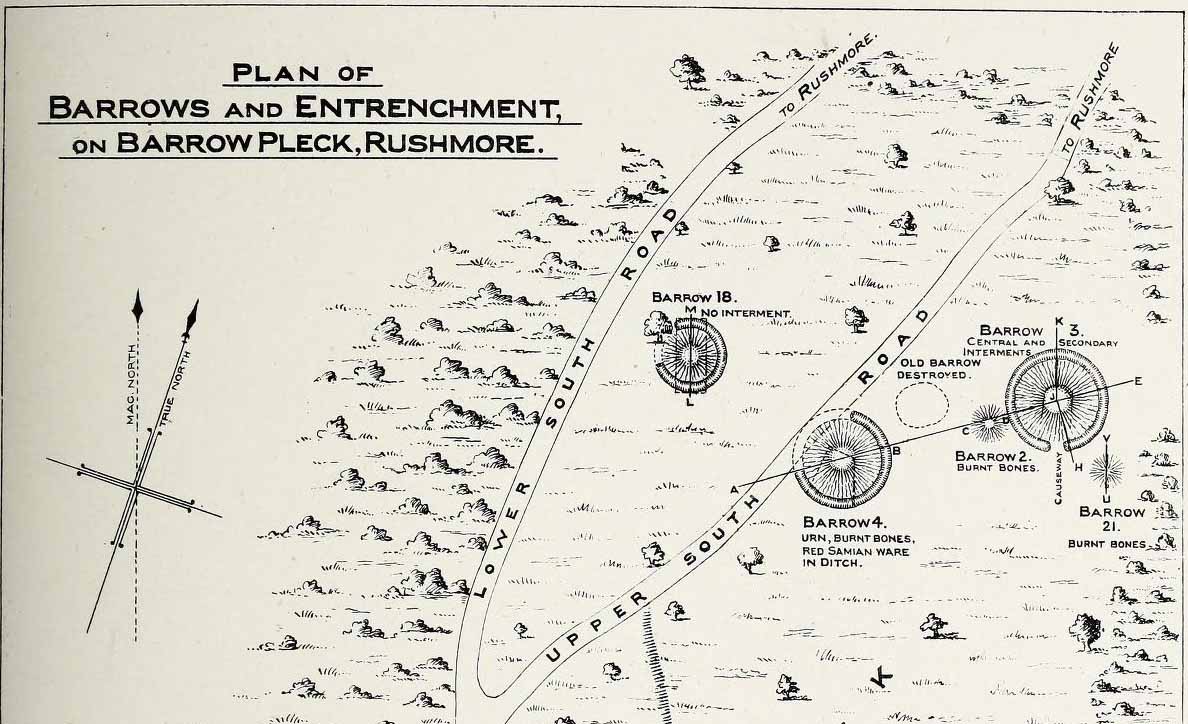 “a collection of large barrows near the South Lodge. They were covered with a thick grove of hazel and other underwood. One of the barrows—marked by a dotted circle (see sketch-map, left, PB)—had been destroyed before my arrival at Rushmore in 1880. The earth of the barrow had been removed and a good urn found in it, which had been broken and scattered, but I was fortunate enough to recover one of the fragments which had been preserved by the estate carpenter.”