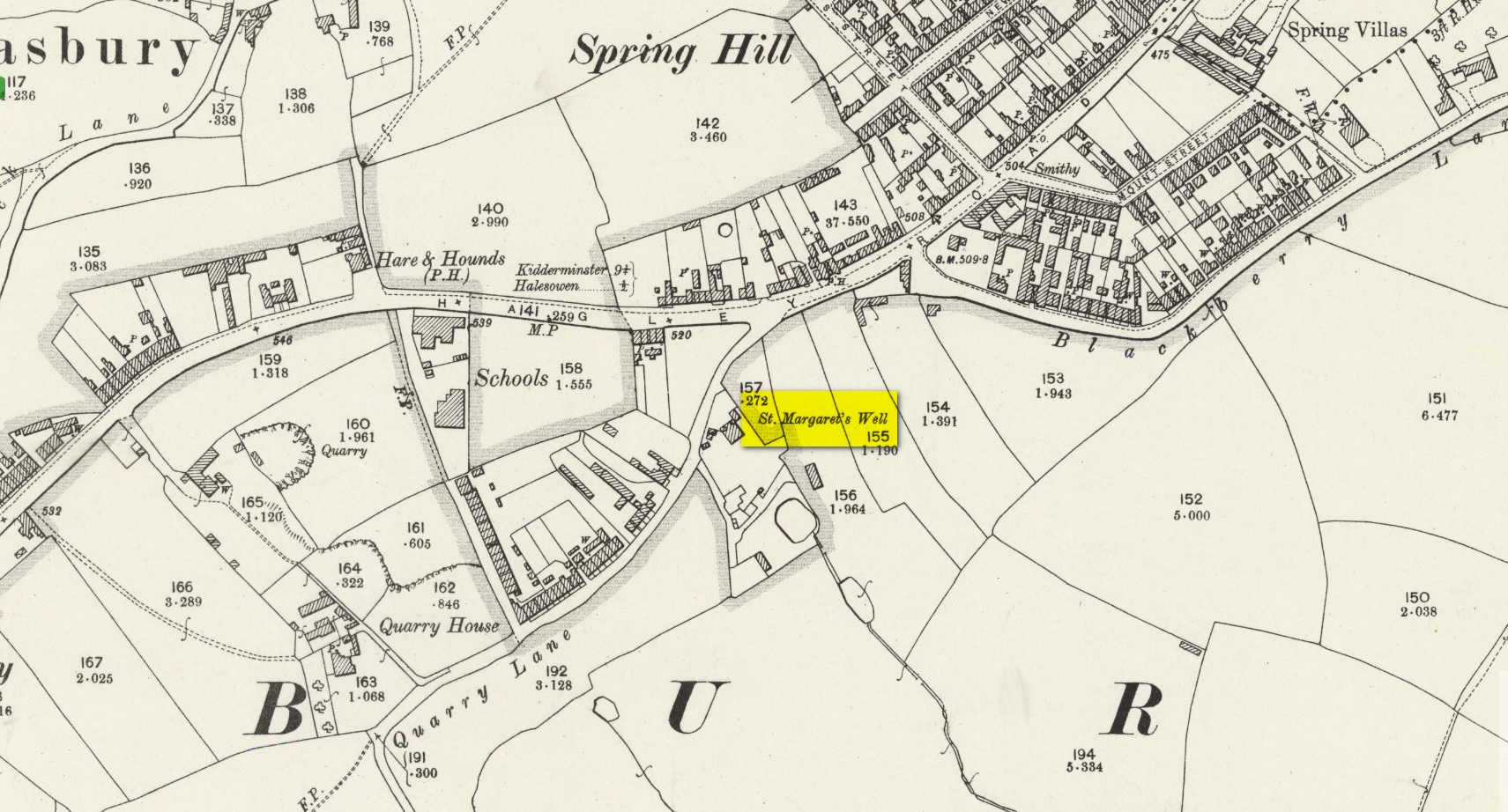 “in the private grounds of a house recently erected, and is a spring issuing from the Halesowen Sandstone at the junction of two faults (shown west of the ‘H’ of Hasbury on the new series Geological Map, Sheet 168) about 100 yds SW of the point where Blackberry Lane joins Hagley Road. It is referred to, as a well of good cold unmineralised water, by T. Nash in 1781.”
