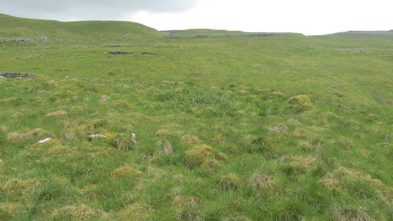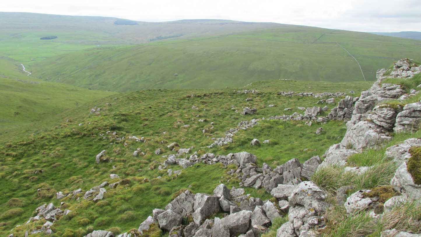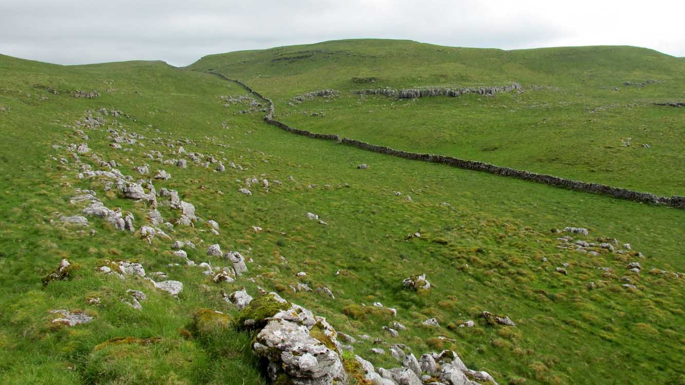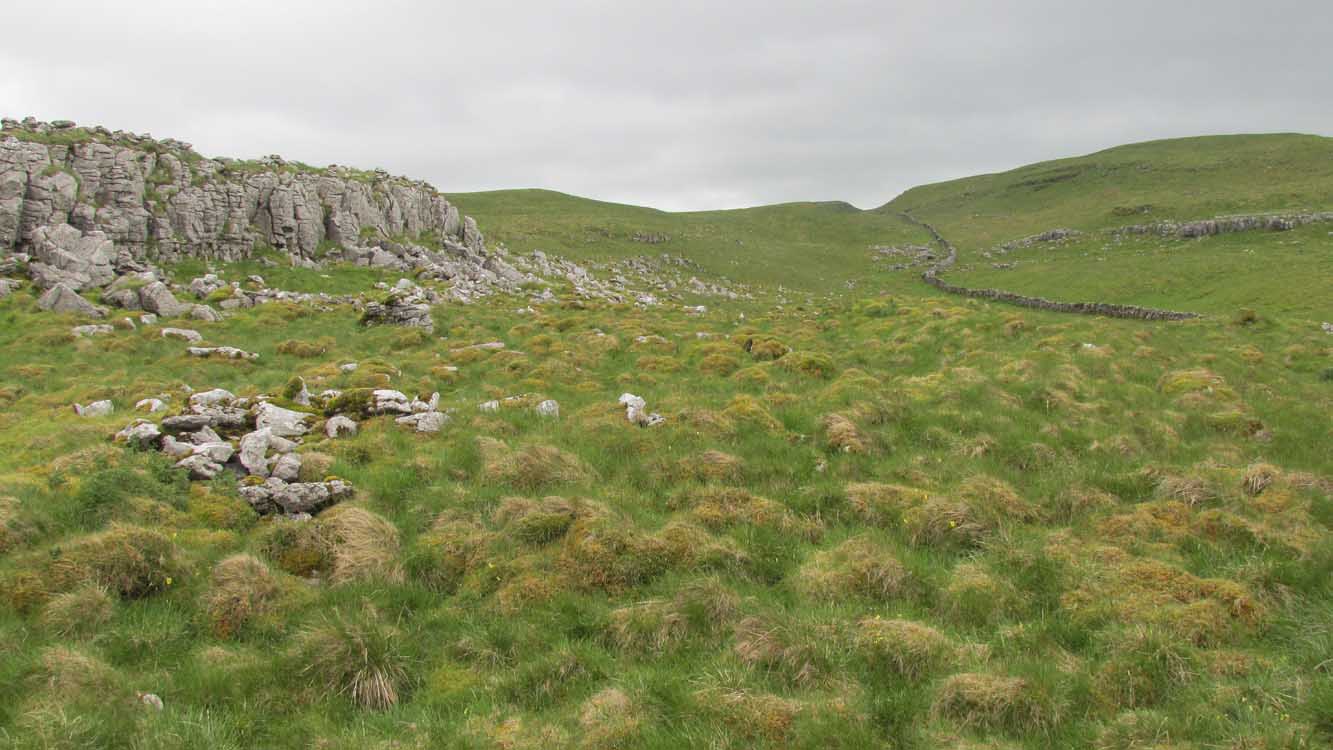 Going along the B6160 road from Grassington to Kettlewell and taking the little road to Arncliffe on your left just a few hundred yards past Kilnsey Crags, after ¾ of a mile keep your eyes peeled for the small parking spot on the left-side of the road, with the steep rocky stream that leads up to the Sleet Gill Cave. Walk up this steep slope, following the same directions to reach the Sleets Gill Top enclosure. From here you’ll notice a large gap in the rocky crags about 200 yards WSW that you can walk through. On the other side of this gap, along a small footpath about another 200 yards along you’ll reach a large ovoid rock. Just before this, on your right, is a long rocky rise with distinct drystone walling below it. That’s the spot!